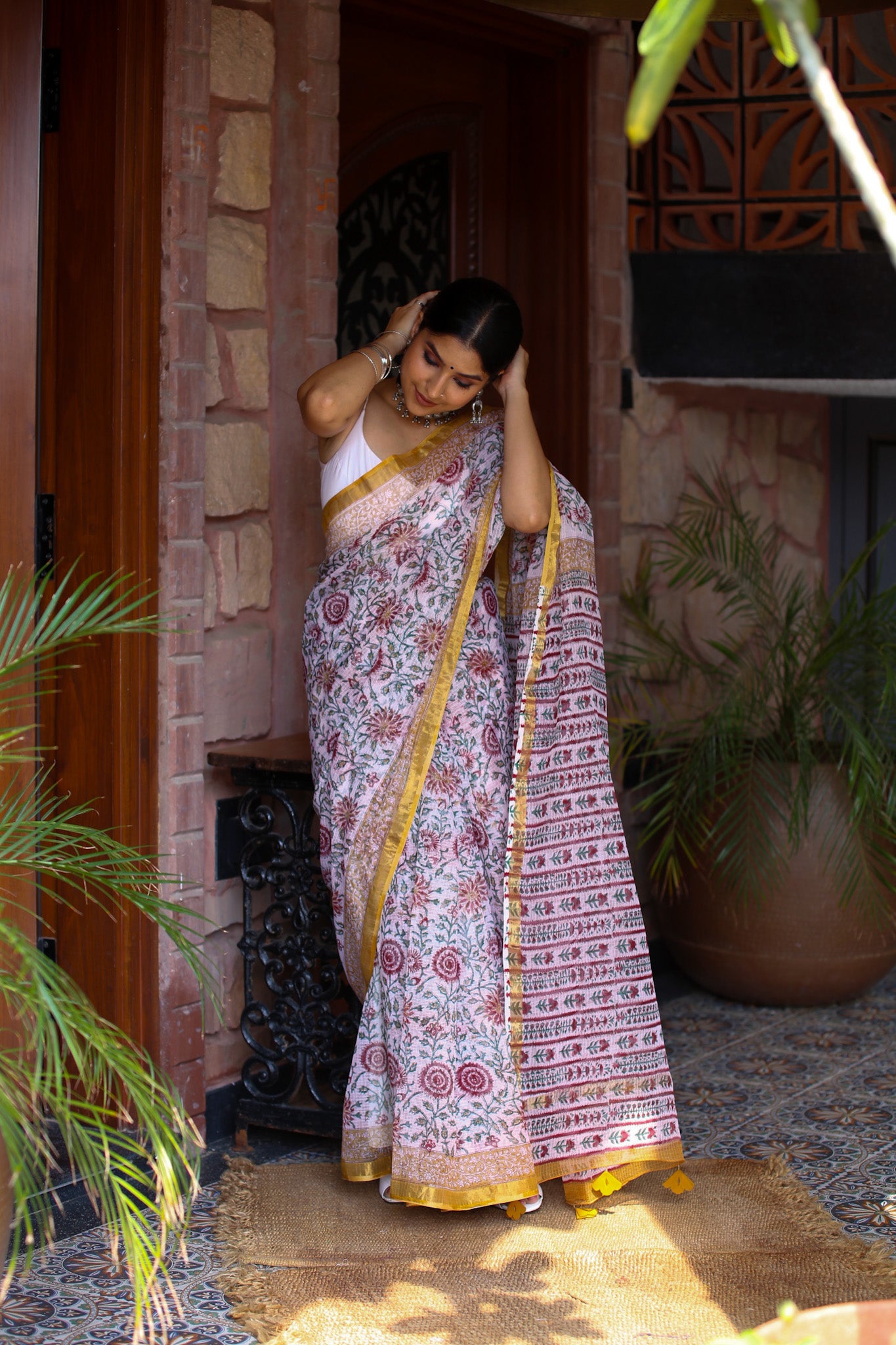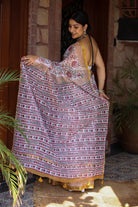 The White Sanganeri Handblock Print Kota Doria Saree is a classic piece, featuring delicate Sanganeri motifs on a crisp white background. Light, breathable, and elegant, this saree is perfect for daytime events and casual wear.