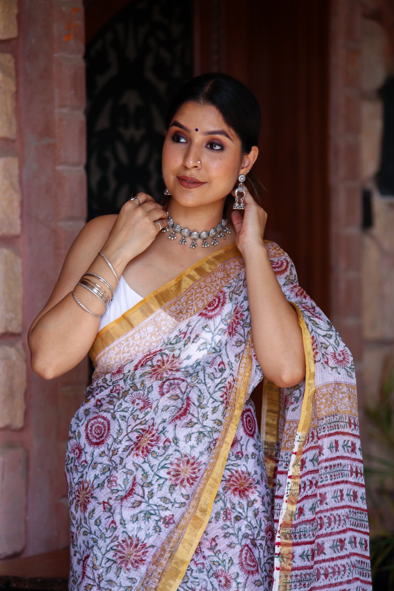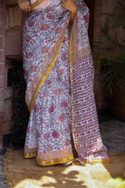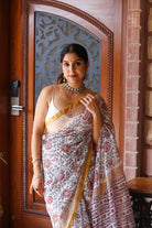 White Sanganeri Handblock Kota Doria Saree