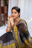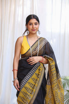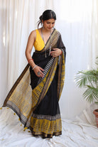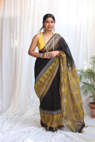 Bold and beautiful, this Bagru handblock printed black saree features intricate motifs on a contrasting yellow base for the border and pallu. A timeless beauty for cultural celebrations.