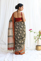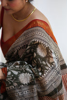 Vanya : Dark Mehndi Maheshwari Saree with Red Border (Bagru Handblock)