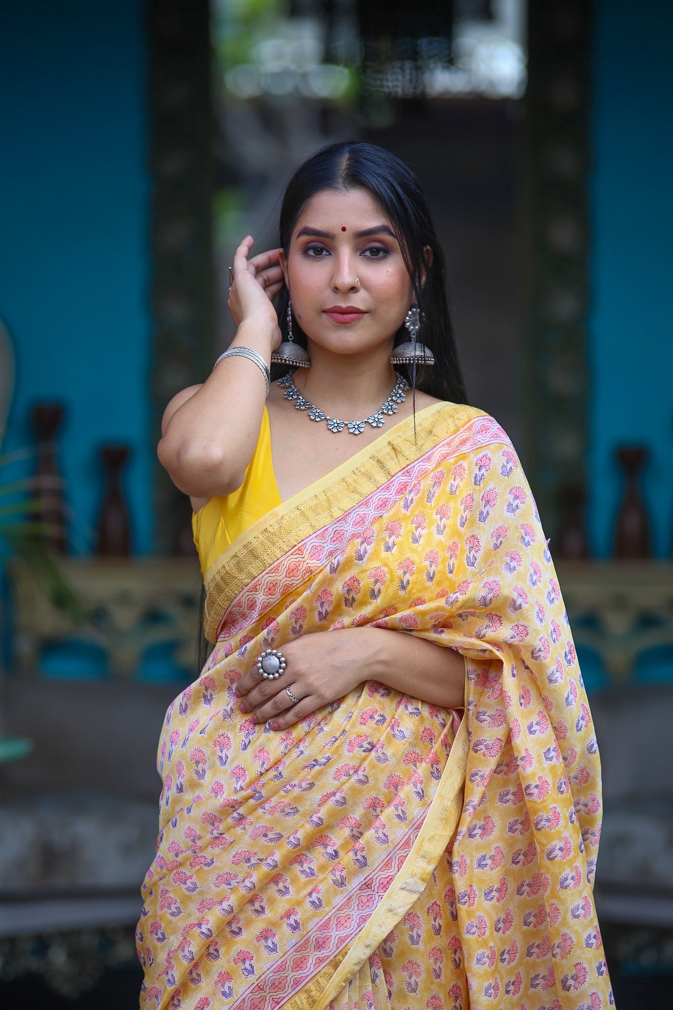 - Traditional Motifs: Inspired by the natural beauty and architecture of Maheshwar, the motifs on these sarees are often intricate and symbolic.