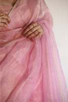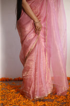 Delicate and dreamy, this baby pink saree in handloom Kota Doria silk by gold tissue silk offers a soft shimmer and weightless drape. The subtle gold undertone adds warmth, perfect for intimate occasions or casual elegance. Paired with a baby pink blouse, zari border, and handmade tassels.