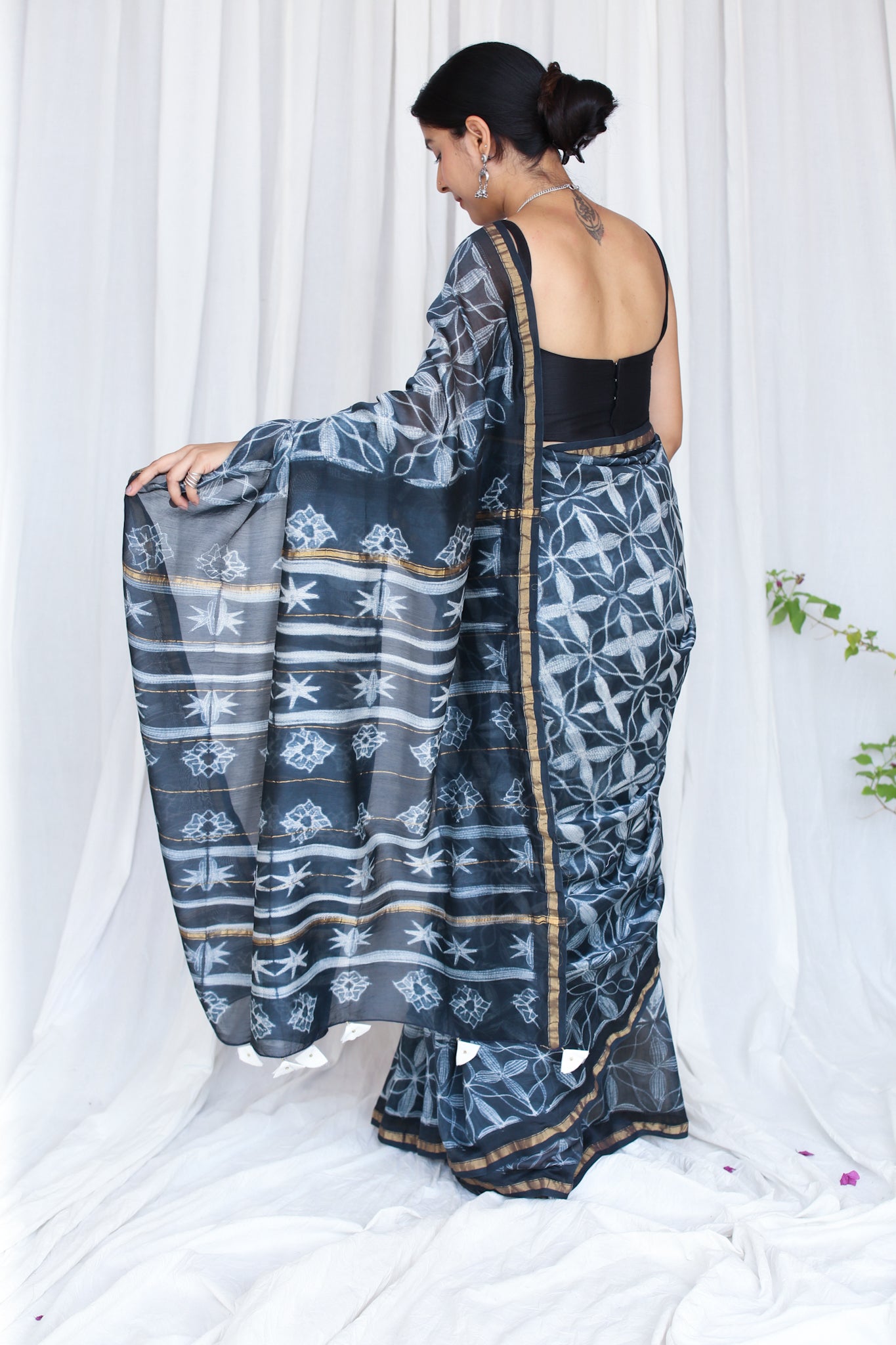 Other Details : Silk by Cotton, 5.5m length, 45'' width, 80-90 cm Blouse length, Needle Shibori, Handmade Tassels on pallu.