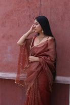 Deep and regal, this maroon saree is woven in handloom Kota Doria silk by gold tissue silk, blending rich color with a glowing golden dual tone. Its airy texture and graceful drape make it a standout for festive evenings. Comes with a maroon blouse, zari border, and handcrafted tassels.