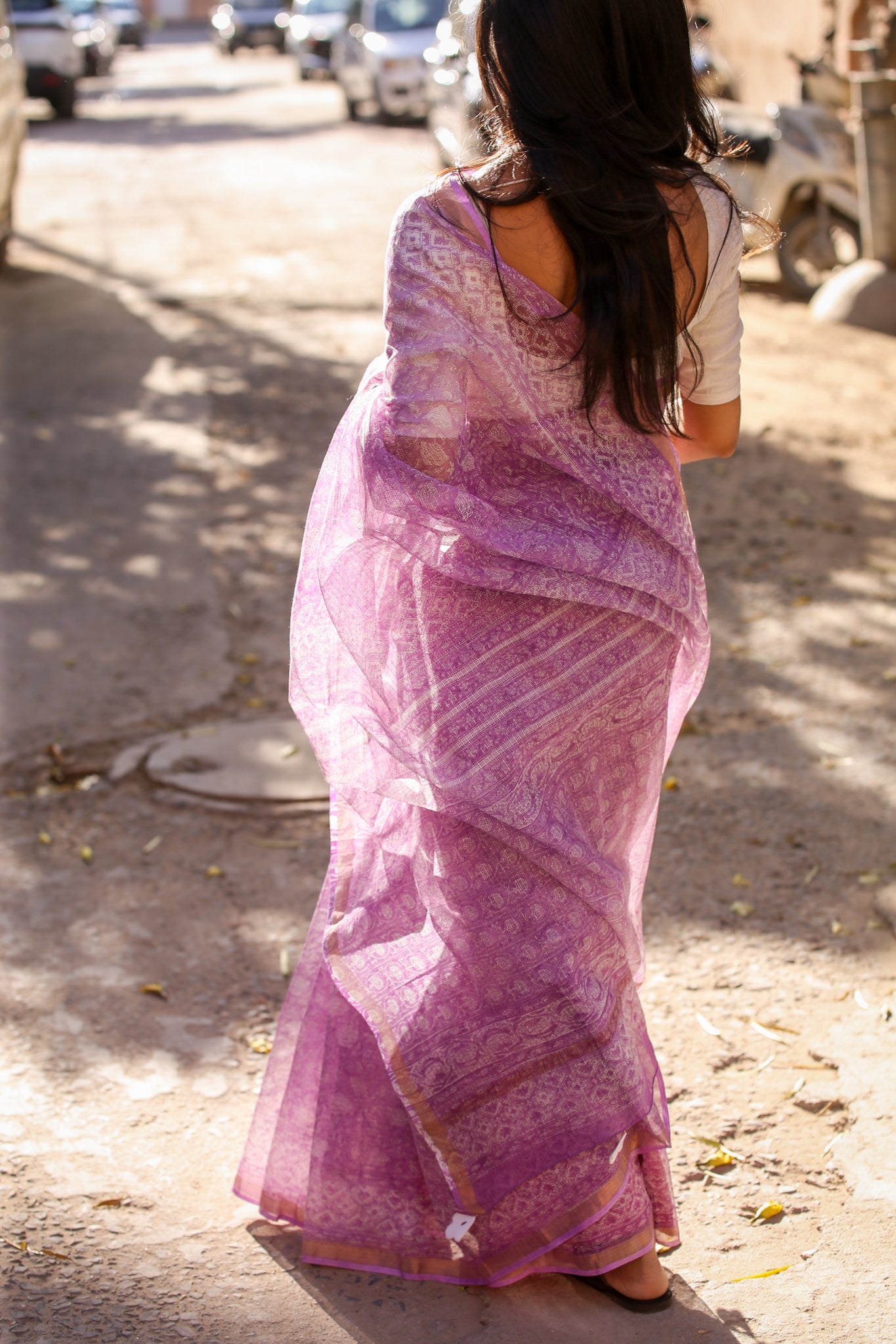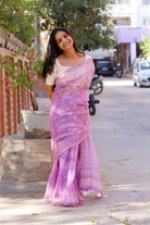 This soothing lavender saree features a monochrome floral jaal created through intricate Sanganeri handblock printing. The delicate patterns spread across the airy Kota Doria fabric, framed with a zari border and finished with handmade tassels for understated elegance.