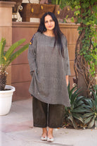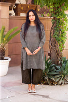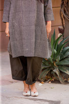This kurta is printed with classic black handblock checks on lightweight cotton, creating a clean and graphic look.