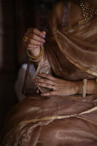 Understated yet luxurious, this bronze-hued saree is woven in handloom Kota Doria silk by gold tissue silk, creating a rich golden sheen with every movement. The fluid drape and airy texture make it both timeless and contemporary. Includes a matching bronze blouse, zari border, and handmade tassels.
