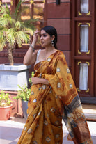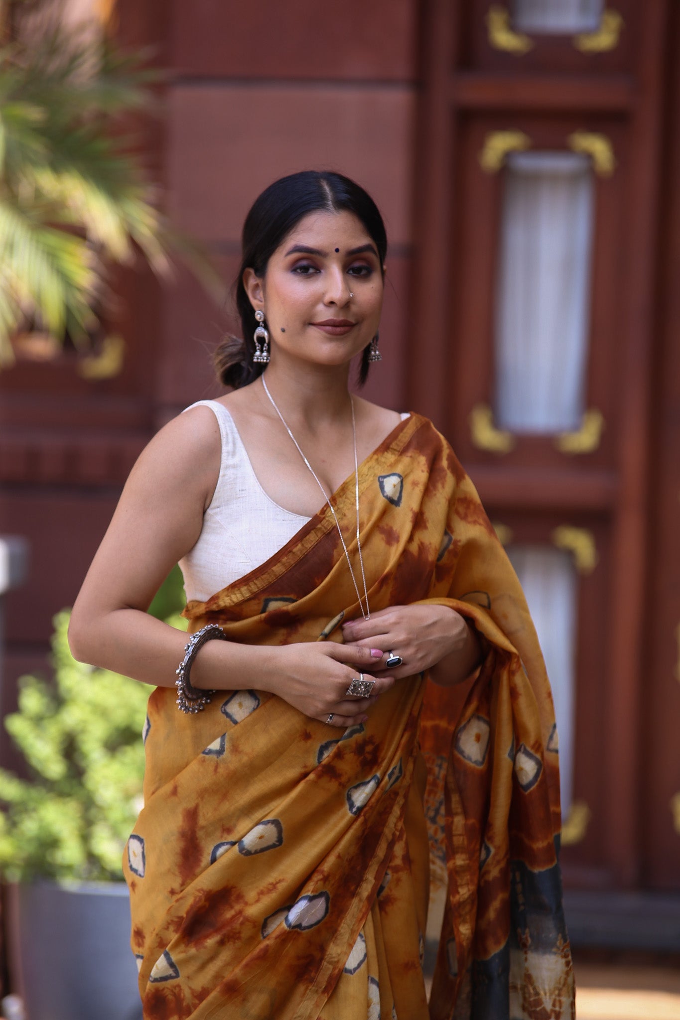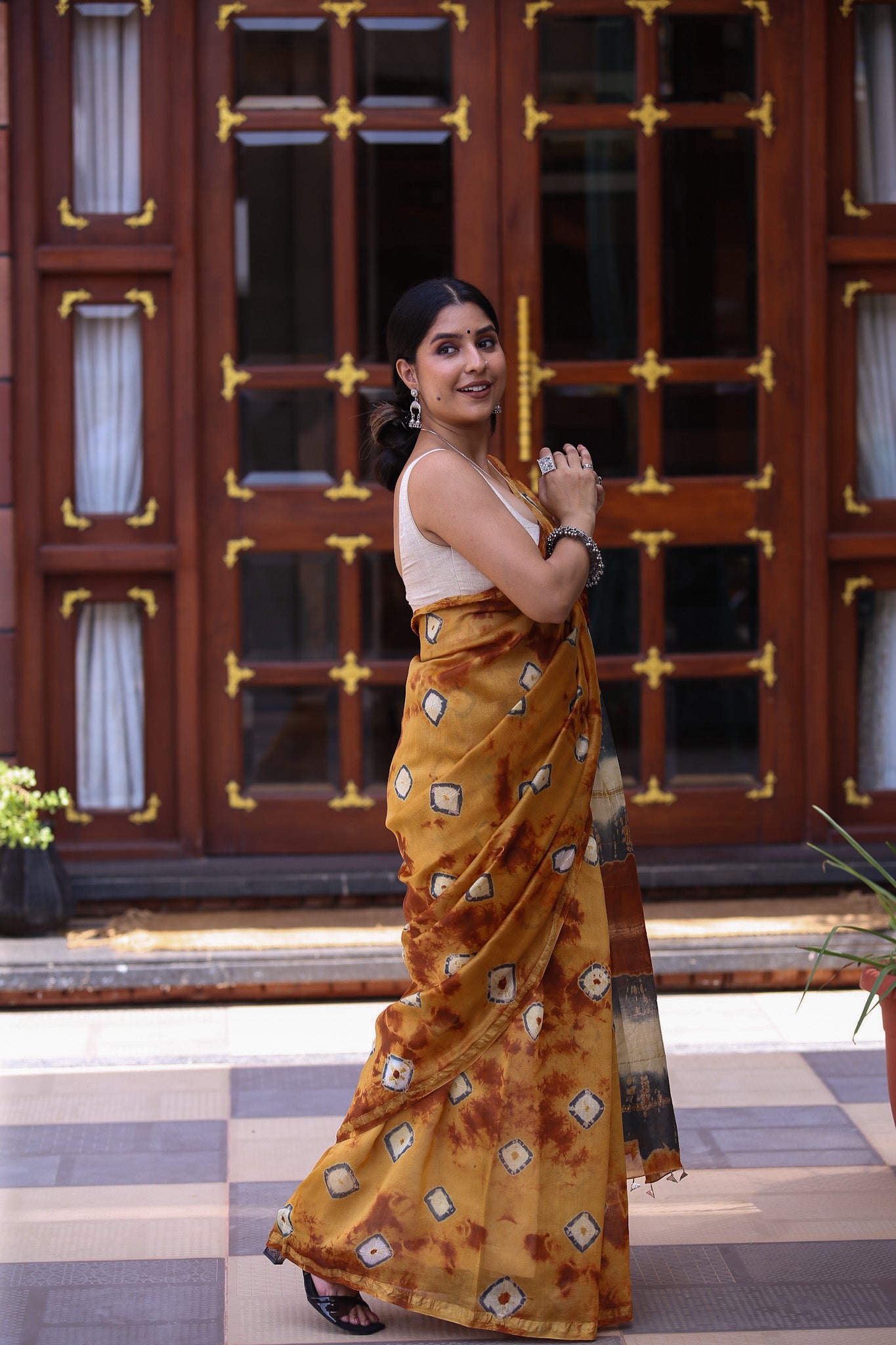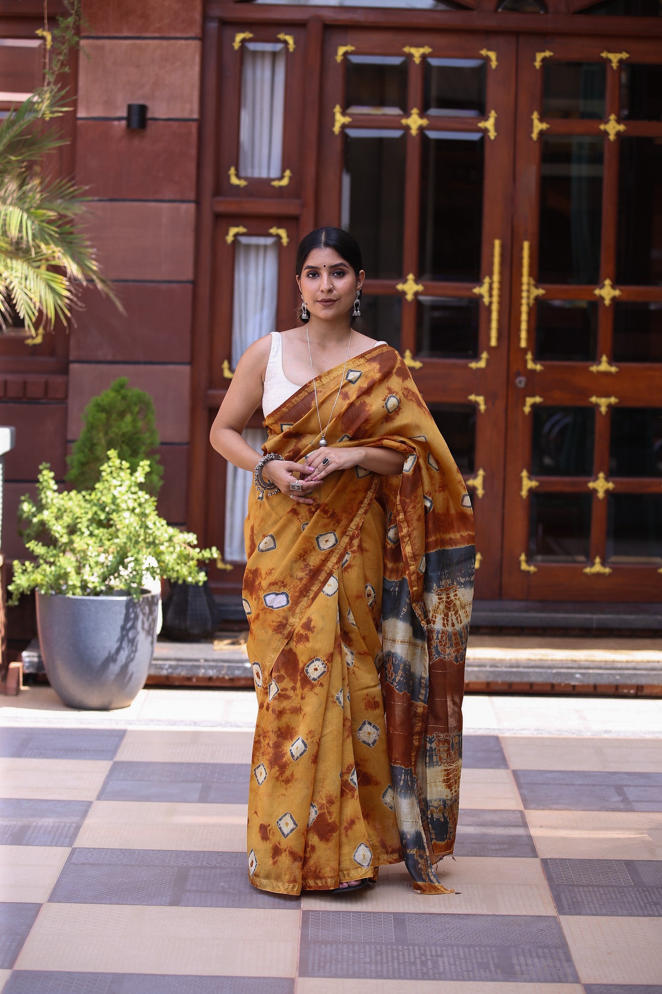 Sophisticated yet vibrant, the Dark Mustard Grey Tie-Dye Chanderi Silk Cotton Saree merges traditional tie-dye patterns with a subtle, earthy palette. The soft fabric and dynamic colors make it perfect for both casual and semi-formal events.