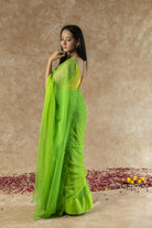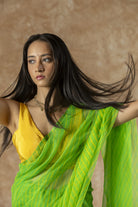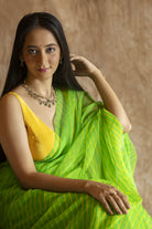 Experience the exquisite elegance of the Green Yellow Double Colored Lehriya Saree. Crafted from the finest 100% pure silk georgette, this saree boasts captivating undulating designs achieved through the traditional lehriya tie and dye process by skilled artisans in Rajasthan.