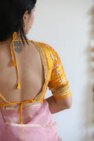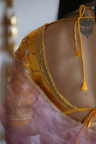 Inspired by the festive kanchlis of Marwar, this radiant yellow satin silk blouse shines with hand-embroidered gota patti and star motifs. The design evokes the glow of pukhraj (yellow sapphire), a gemstone of prosperity and joy. Perfect with pastel or contrasting sarees, especially for haldi, mehendi, and sunlit day functions.