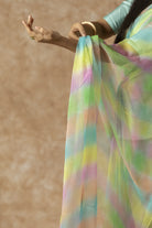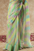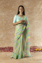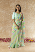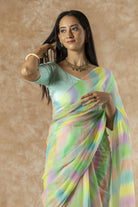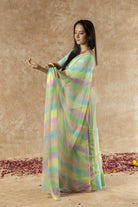 Indulge in the luxurious Multicolor Lehriya Saree. Crafted from premium 100% pure silk georgette, this saree showcases striking diagonal thick stripes designs achieved through the intricate leheriya tie and dye method, a signature of skilled Rajasthani artisans.