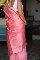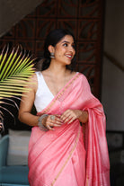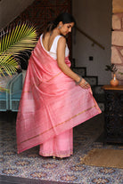 This exquisite peach-colored discharge handblock print saree is a perfect fusion of tradition and modern elegance. Accentuated with a rich zari border, its lightweight fabric and graceful design make it an ideal choice for both daytime sophistication and evening charm.