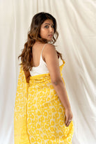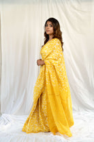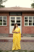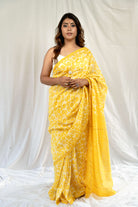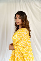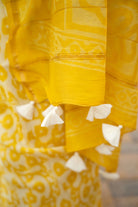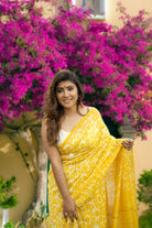 Brighten up your Traditional wardrobe with this attractive Yellow Chanderi saree hand-block printed with Batik Motifs and a Golden Zari border. The 5.5 meter saree comes with an 80-90 cm blouse material. Ideal for formal occasions, this saree must be dry-cleaned for best results.