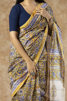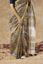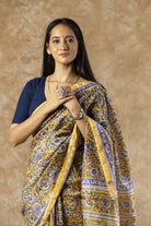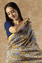 Look beautiful and feel comfortable in this Yellow Blue Sanganeri Block print Saree. Crafted with Chanderi, a luxurious blend of Silk and Cotton, its eye-catching yellow and blue colour will turn heads. The Printed and Zari Border adds an extra touch of radiant elegance to the look.