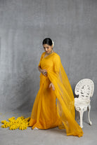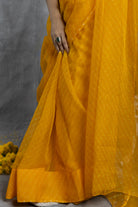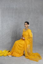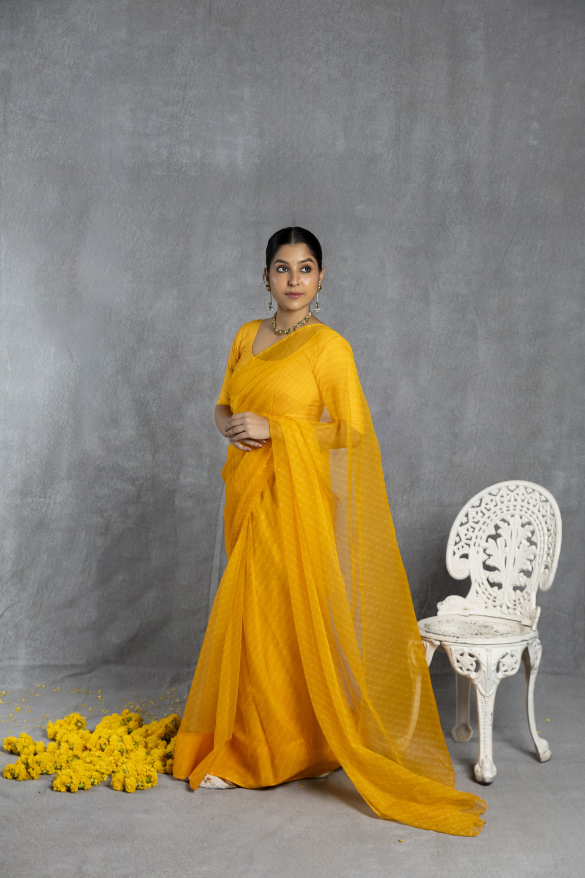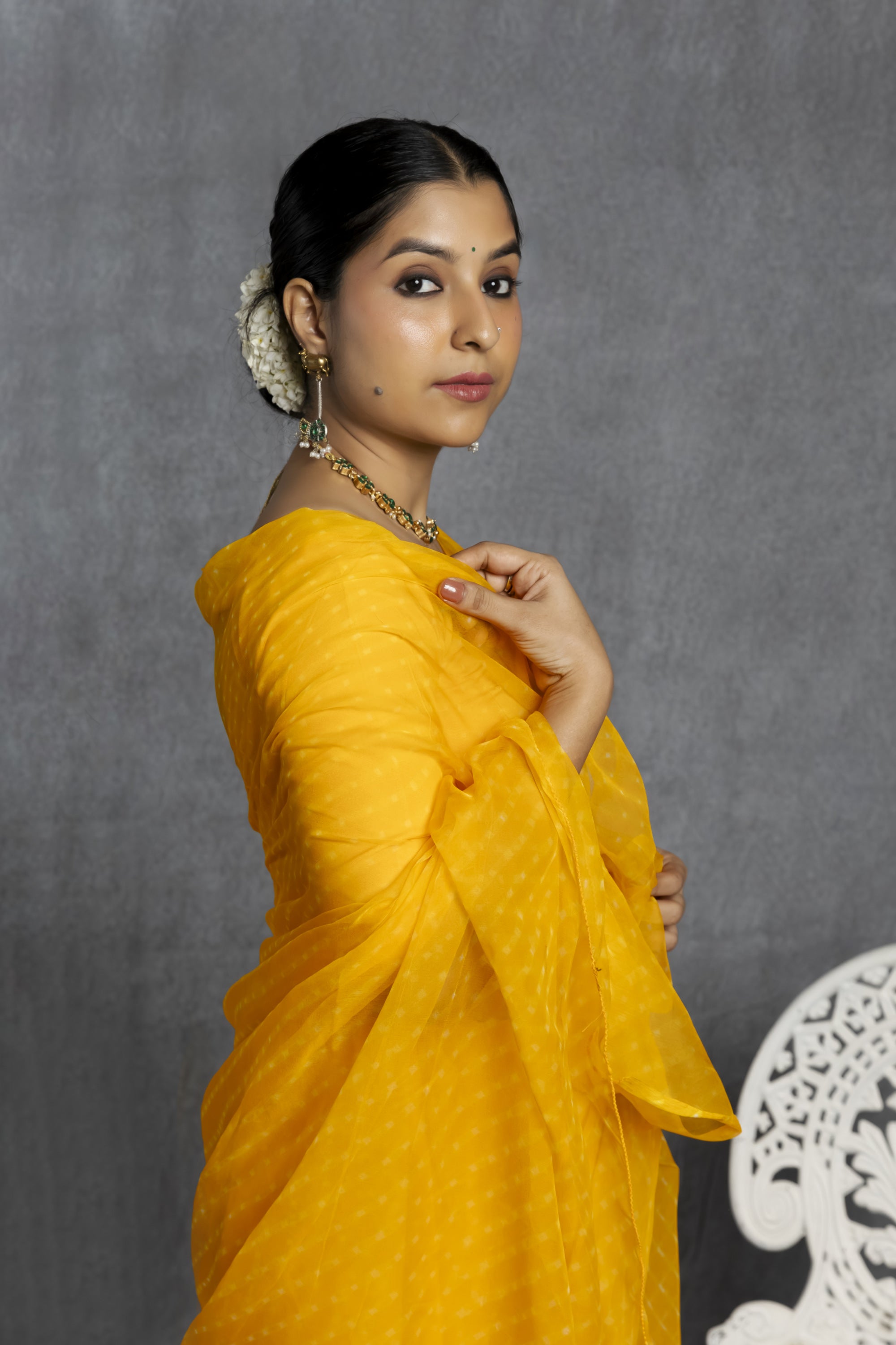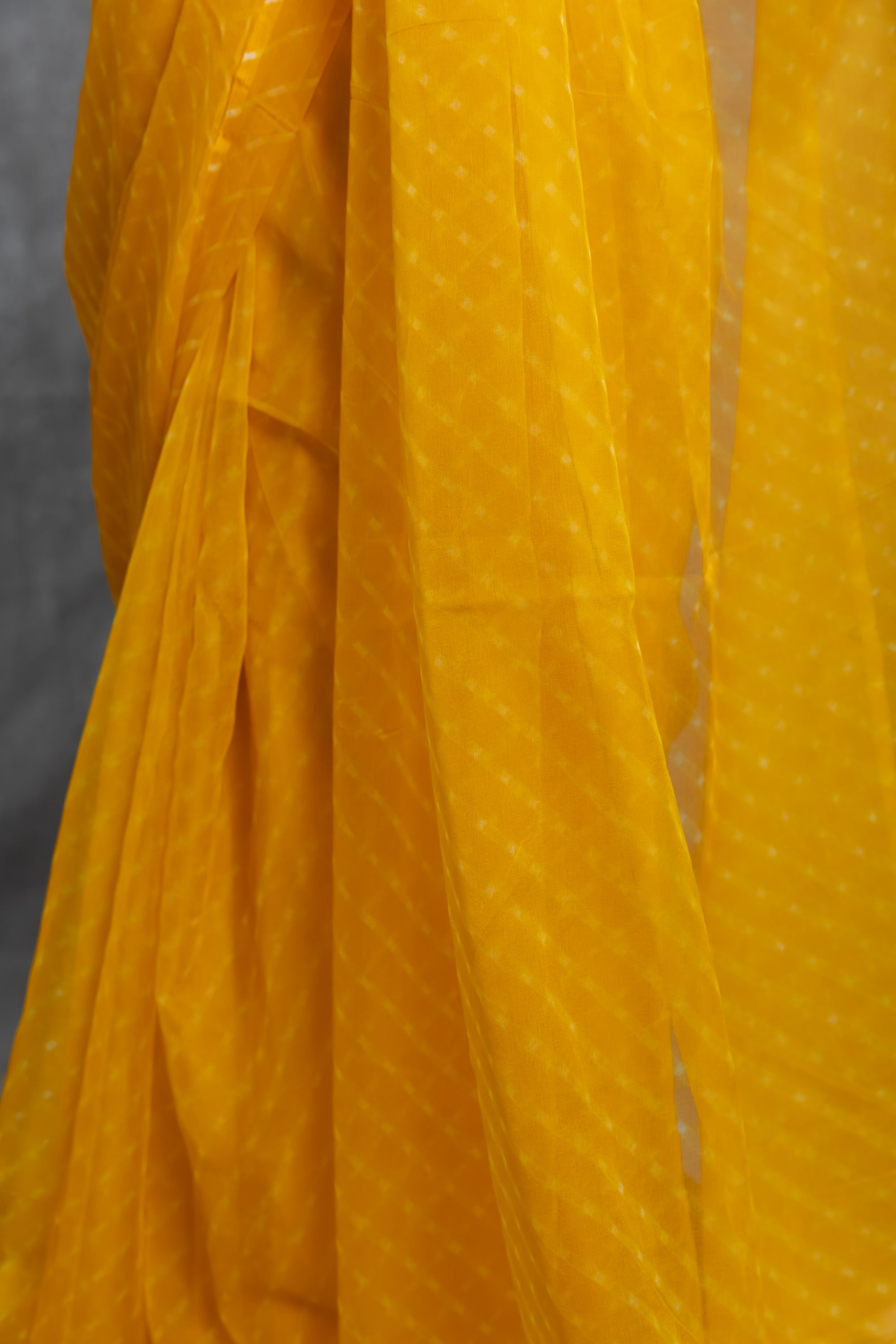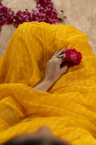 Indulge in the luxurious beauty of the Yellow Mothra (Double Lehriya) Saree. Made from the finest quality 100% pure silk georgette, this saree features stunning wavy patterns created using the traditional lehriya tie and dye technique by skilled artisan families in Rajasthan. A little bleeding of colors are seen while wearing.