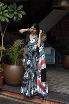 Sleek and contemporary, this Black Grey Tie-dye Cotton Mul Saree combines the timeless beauty of Shibori and bandhej dyeing. The soft cotton mul fabric is perfect for all-day comfort, making this saree an elegant choice for various events.