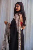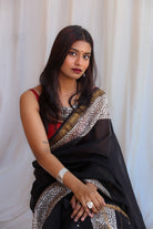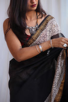 A striking black Maheshwari Silk Cotton saree with a delicately printed beige base border, further enhanced with madder highlights on the pallu. A sophisticated choice for elegant dressing.