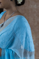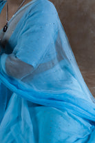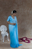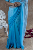 Indulge in the exquisite charm of the Ombre Blue chiffon saree adorned with delicate Mukaish embroidery. Ideal for both day and evening events, this versatile saree is a must-have for any occasion.