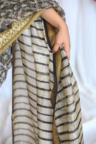 A sophisticated blend of grey and black geometric Bagru prints on a soft Maheshwari silk-cotton base, framed by a striking contrast yellow border. The addition of handmade tassels enhances its artisanal appeal, making it an elegant fusion of tradition and modern style.
