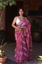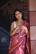 This beetroot shibori cotton Kota Doria saree is a radiant blend of traditional dyeing and modern elegance. The soft hue complements the shibori technique’s unique patterns, while a zari border adds just the right amount of sparkle. It includes an 80-90 cm blouse piece and handmade tassels on the pallu, making it a graceful choice for daytime events or casual gatherings.
