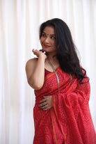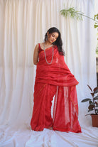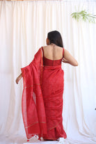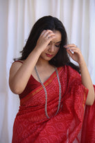 This vibrant saree features a bold geometric print created using the discharge handblock technique, set against a striking red backdrop. The contrast border adds definition, making it an ideal pick for festive celebrations.