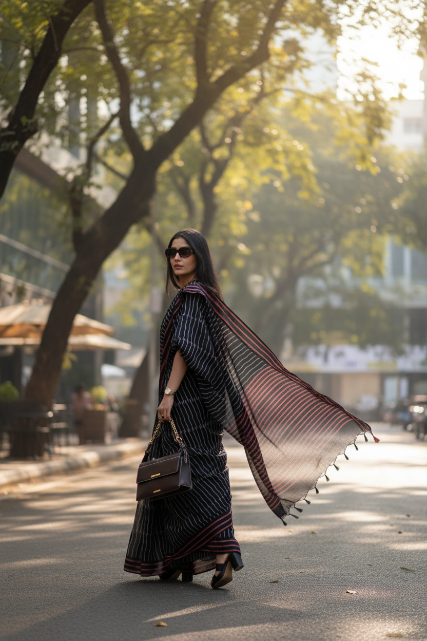 Indulge in the artistry of this handcrafted, azo free dyed saree, featuring a sophisticated Black Red Lining Bagru Print Saree. The matching block print blouse adds an element of authenticity to this soft, formal ensemble. Embody contemporary elegance with this Modernity-inspired piece. For best results, handwash with mild liquid detergent. Handmade Red Fabric tassels on pallu. A must-have for any stylish wardrobe, it's suitable for all occasions.