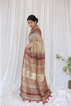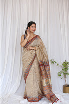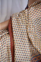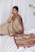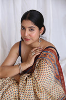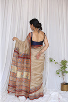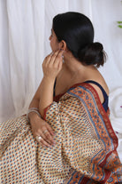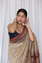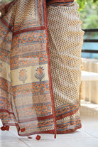 Prachi : Ivory Chanderi Saree with Orange-Blue Bagru Print