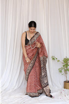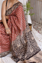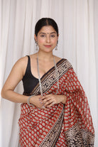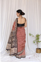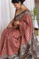 Drape yourself in elegance with this Bagru Handblock Madder Chanderi Saree. The delicate tassels on the pallu add a graceful touch to its timeless charm. Perfect for festive and casual occasions alike.