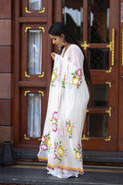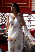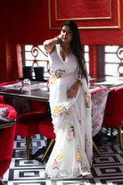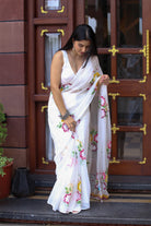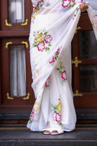 A pristine white saree, beautifully contrasted with vibrant handpainted floral patterns, embodying grace and purity.