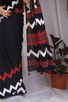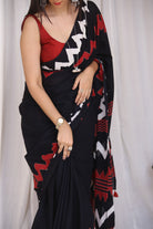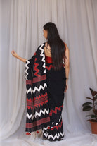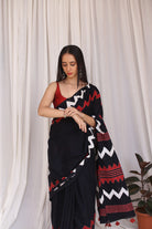 This bold black saree features a striking zigzag discharge block print in madder red and white, adding a rhythmic graphic texture to the look. Made from breathable cotton, it comes with handmade tassels and a matching blouse, making it perfect for both day and evening wear.