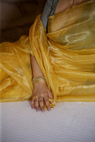 Radiant and refined, this yellow saree in handloom Kota Doria silk by gold tissue silk brings a sunshine glow to any occasion. With a feather-light feel and shimmering golden dual-tone finish, it’s ideal for celebrations or summer weddings. Comes with a coordinated yellow blouse, zari border, and handmade tassels.