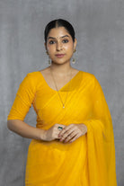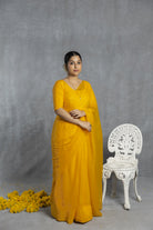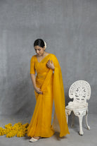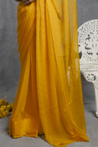 Indulge in the opulent charm of a yellow chiffon saree adorned with intricate Mukaish handwork. Versatile for both day and night, this saree is ideal for any festive occasion.