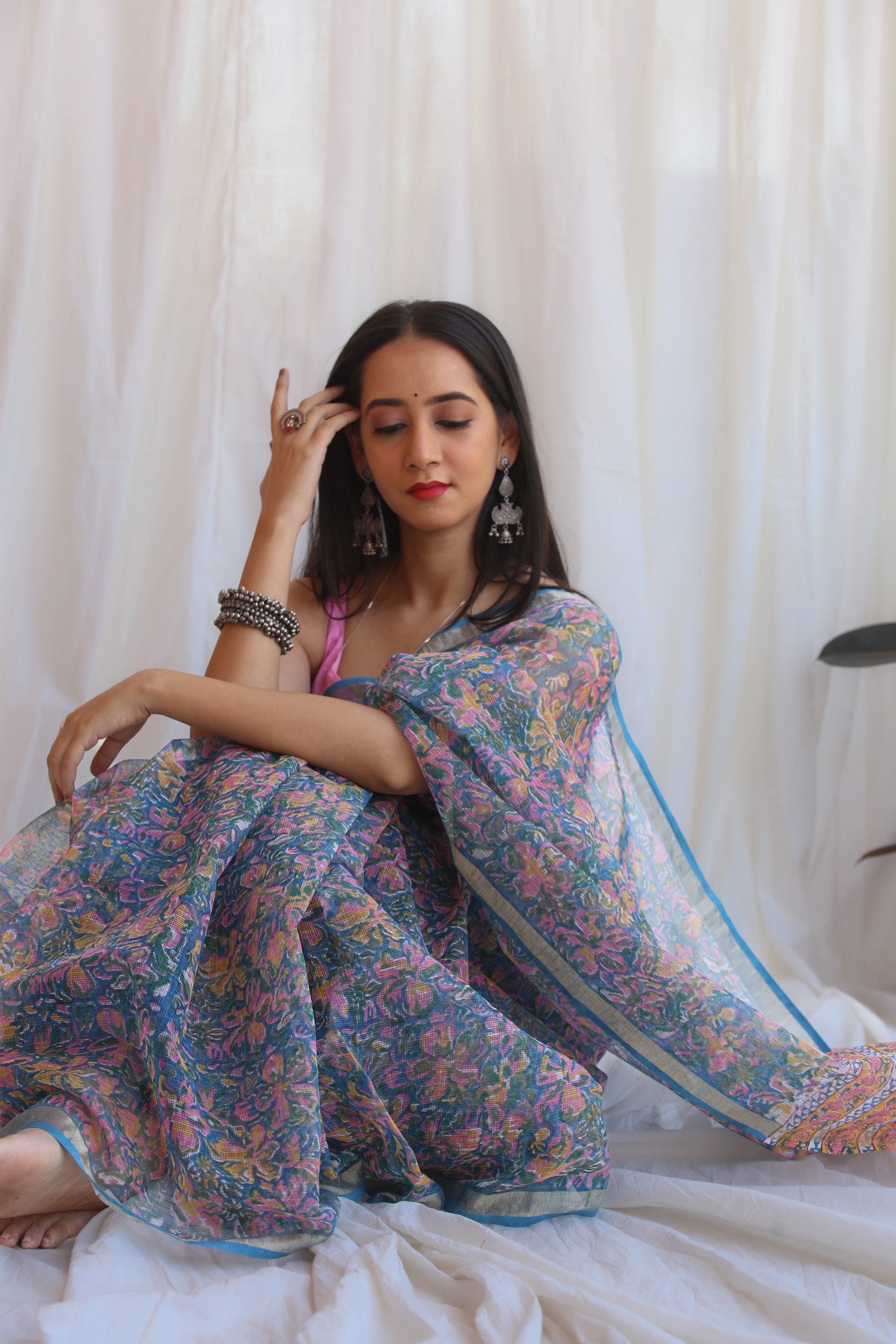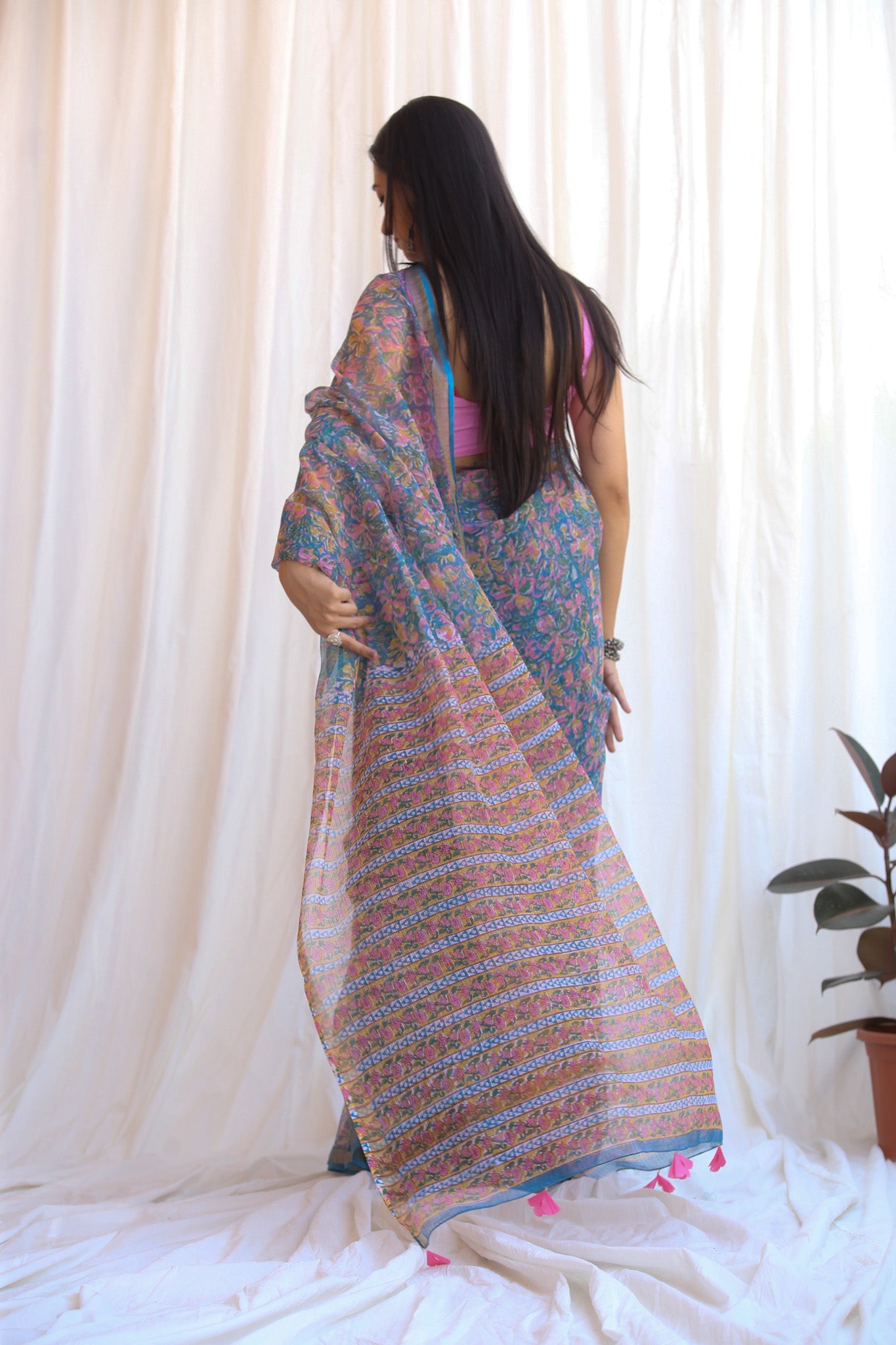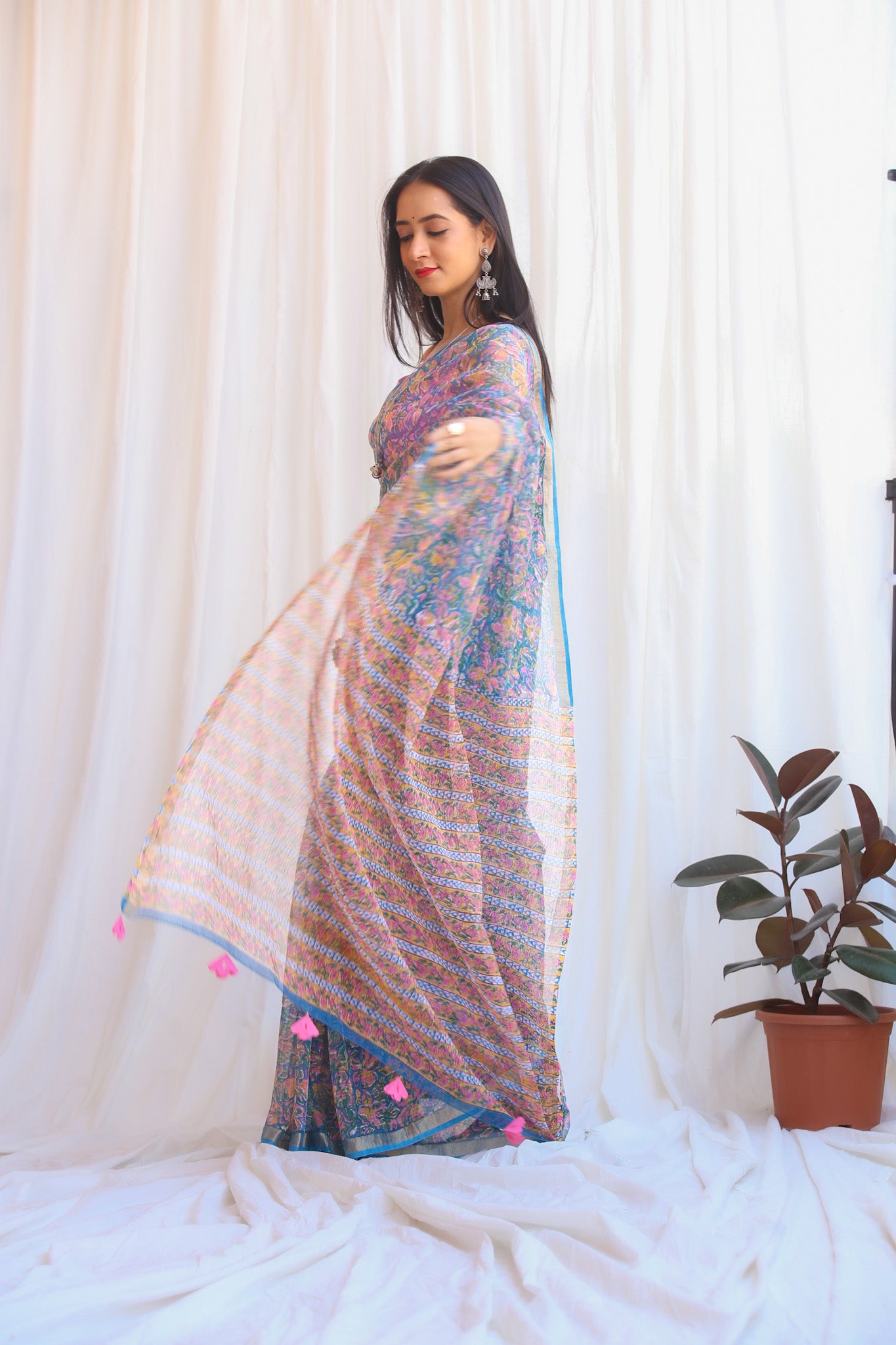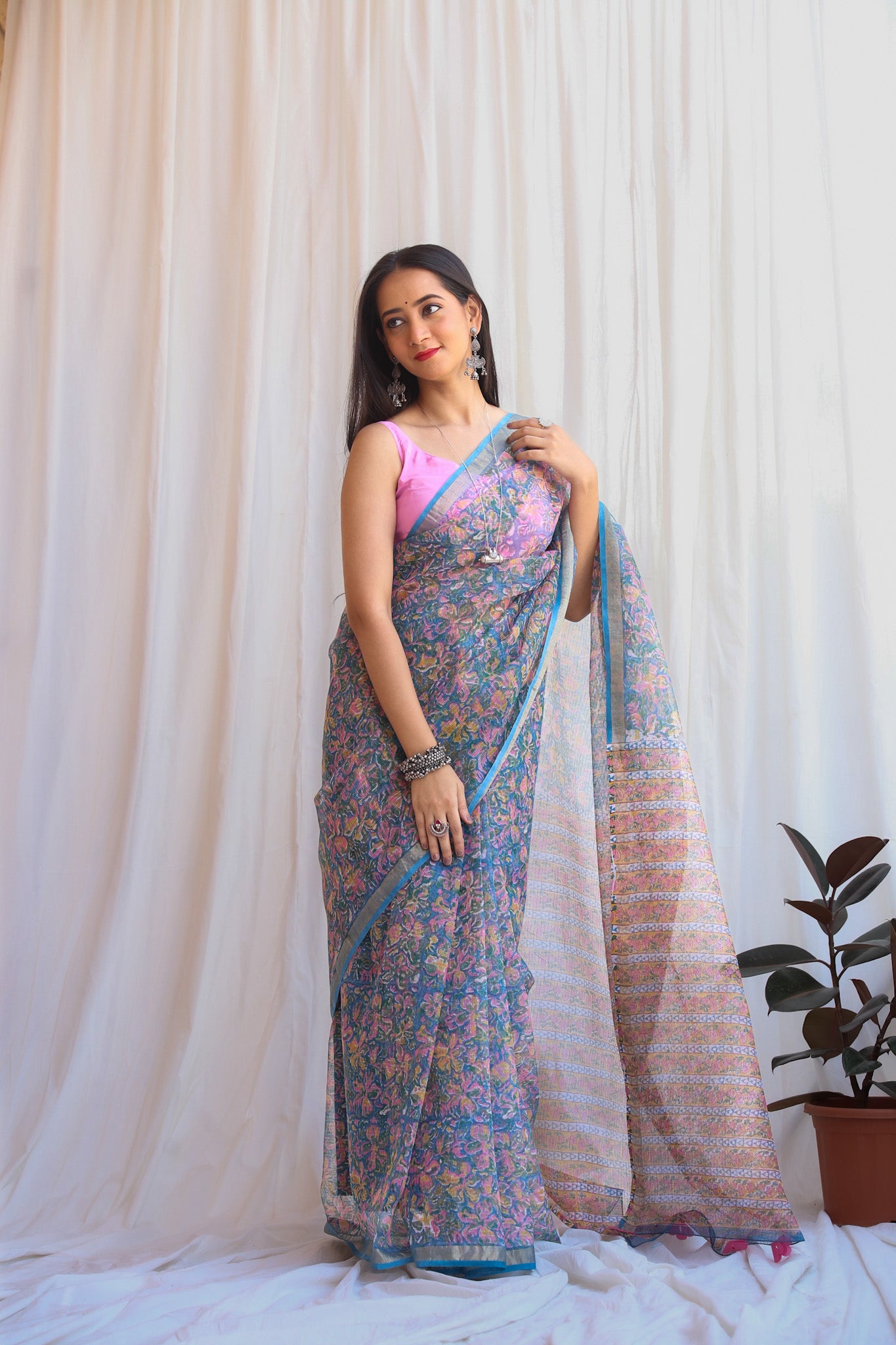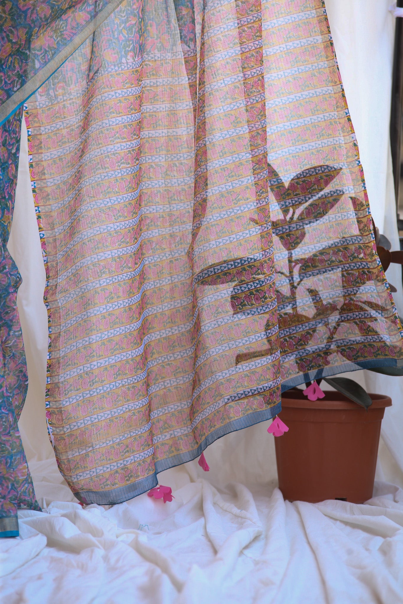 Firdaus : Sanganeri Floral Handblock Kota Doria Saree
