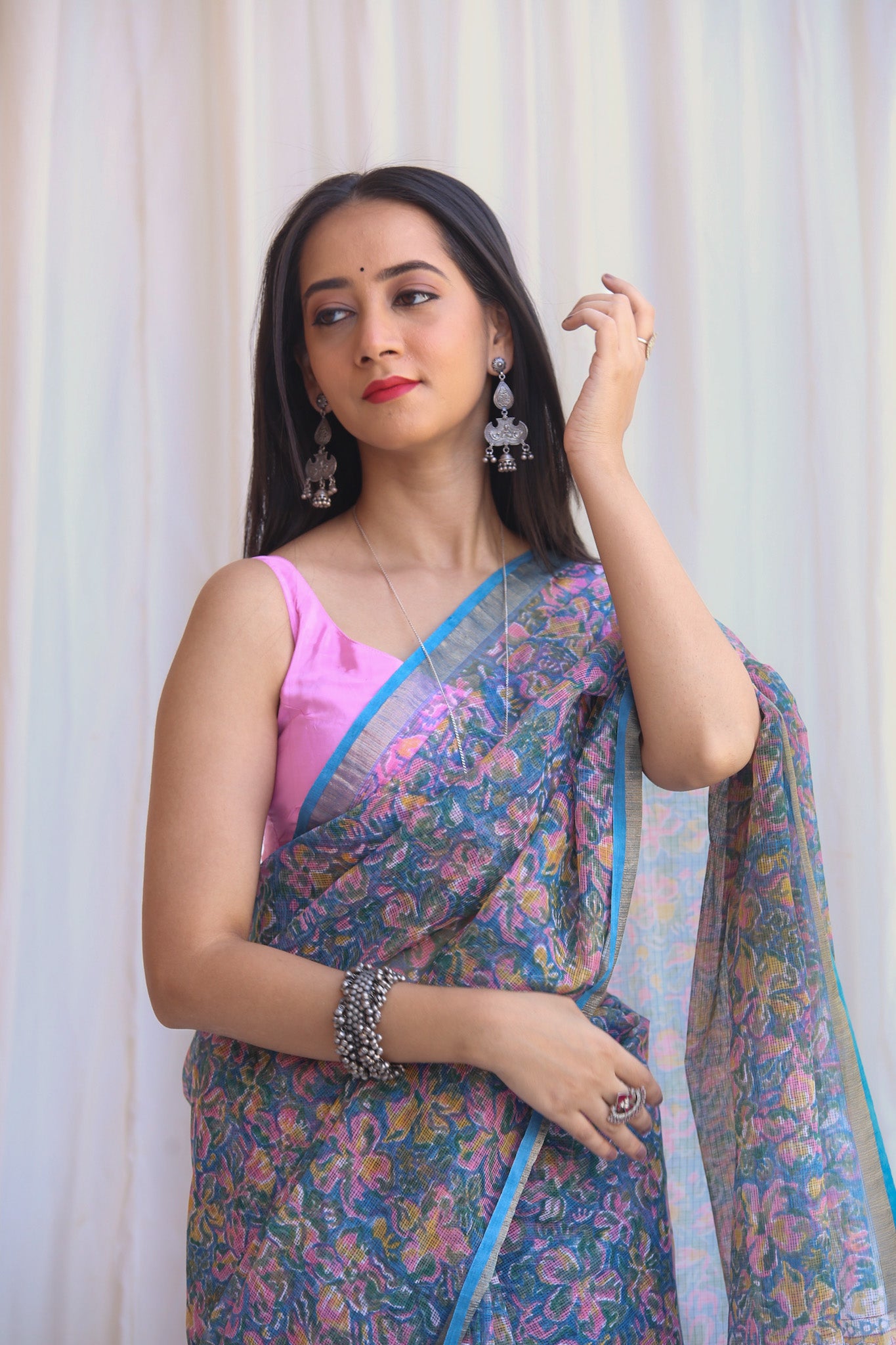 This delicate Kota Doria saree features an all-over Sanageri floral handblock print, enhanced by a striking blue border that lends an artistic edge. The sheer, airy fabric drapes effortlessly, making it a must-have for warm-weather occasions.