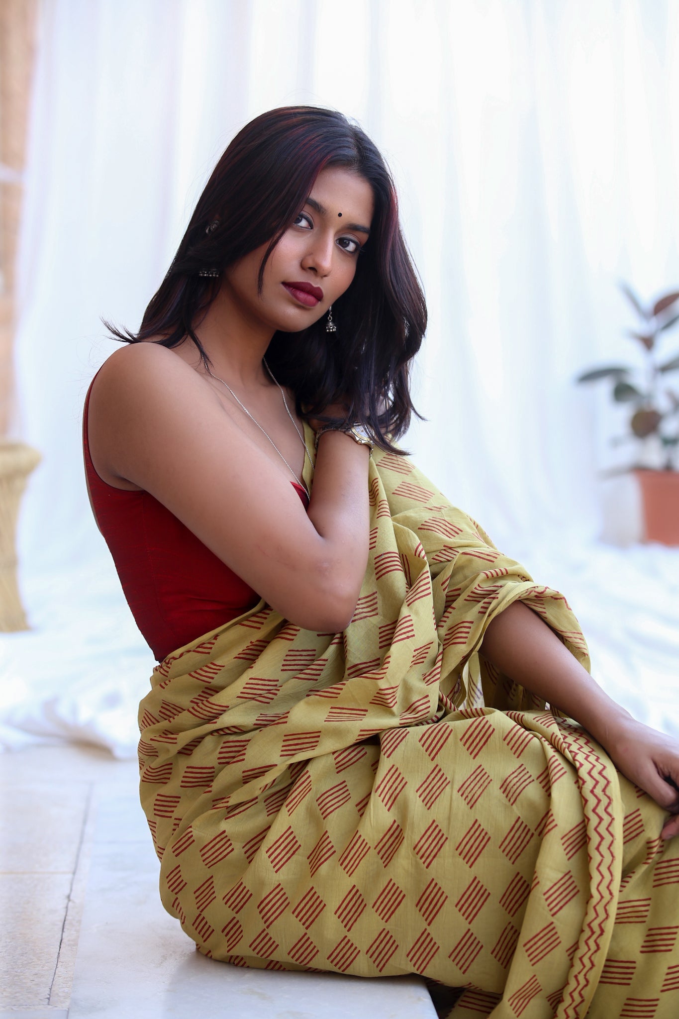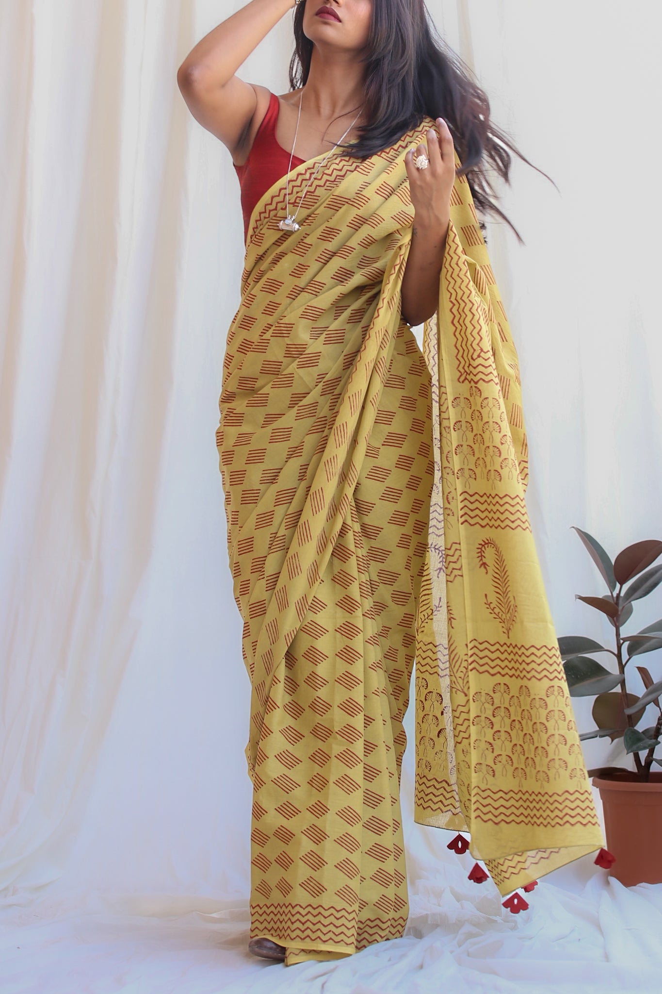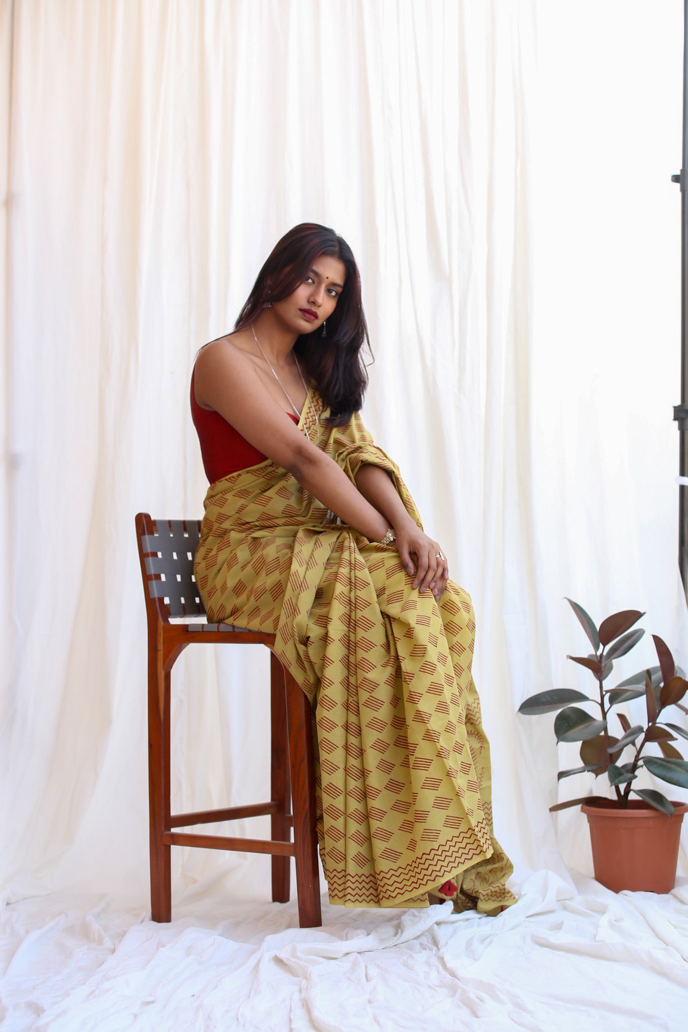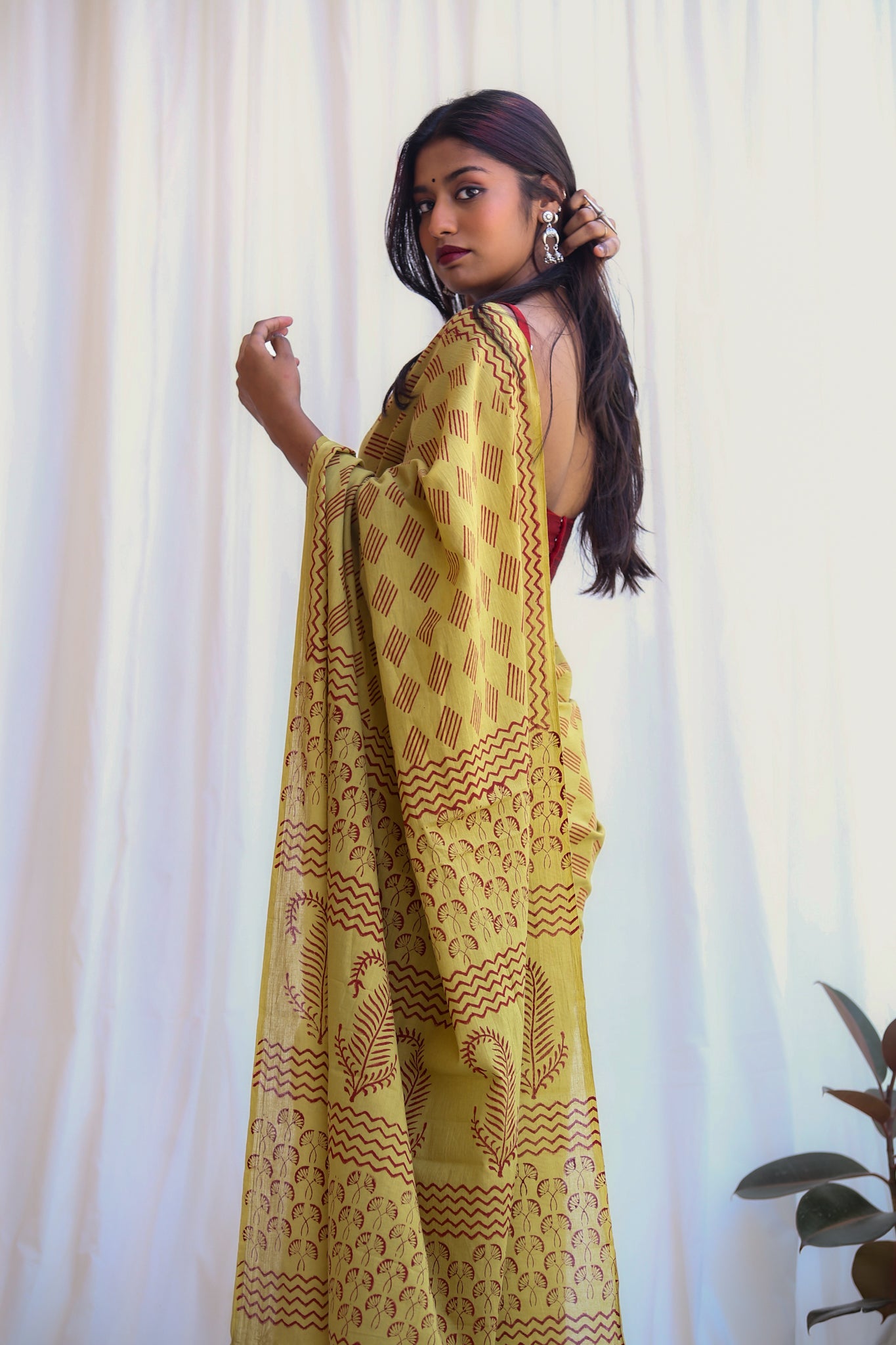 Palash : Pigment Handblock Printed Mehndi Cotton Saree