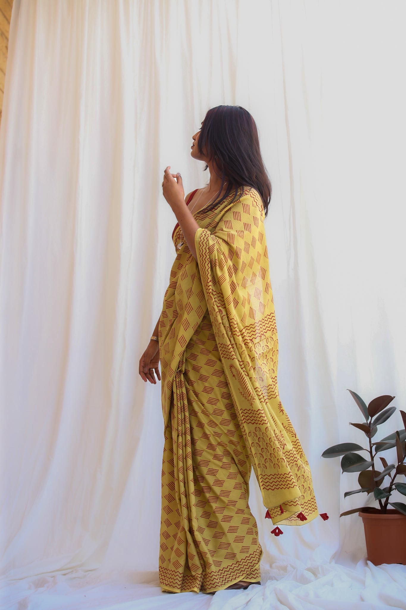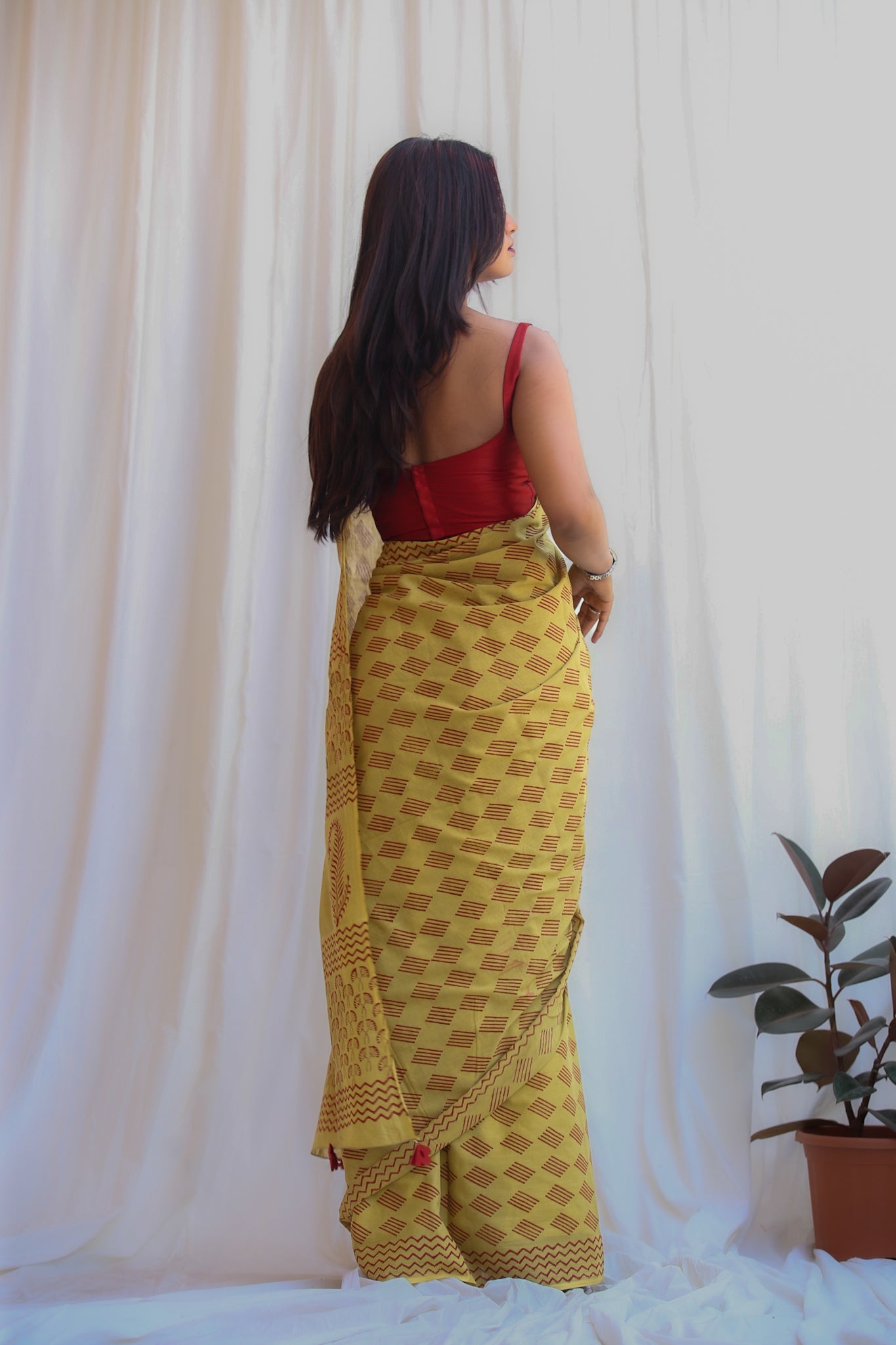 This earthy mehndi-hued cotton saree is adorned with striking madder red pigment handblock prints that add a vibrant yet grounded touch. Handmade tassels on the pallu finish the piece with care and detail.