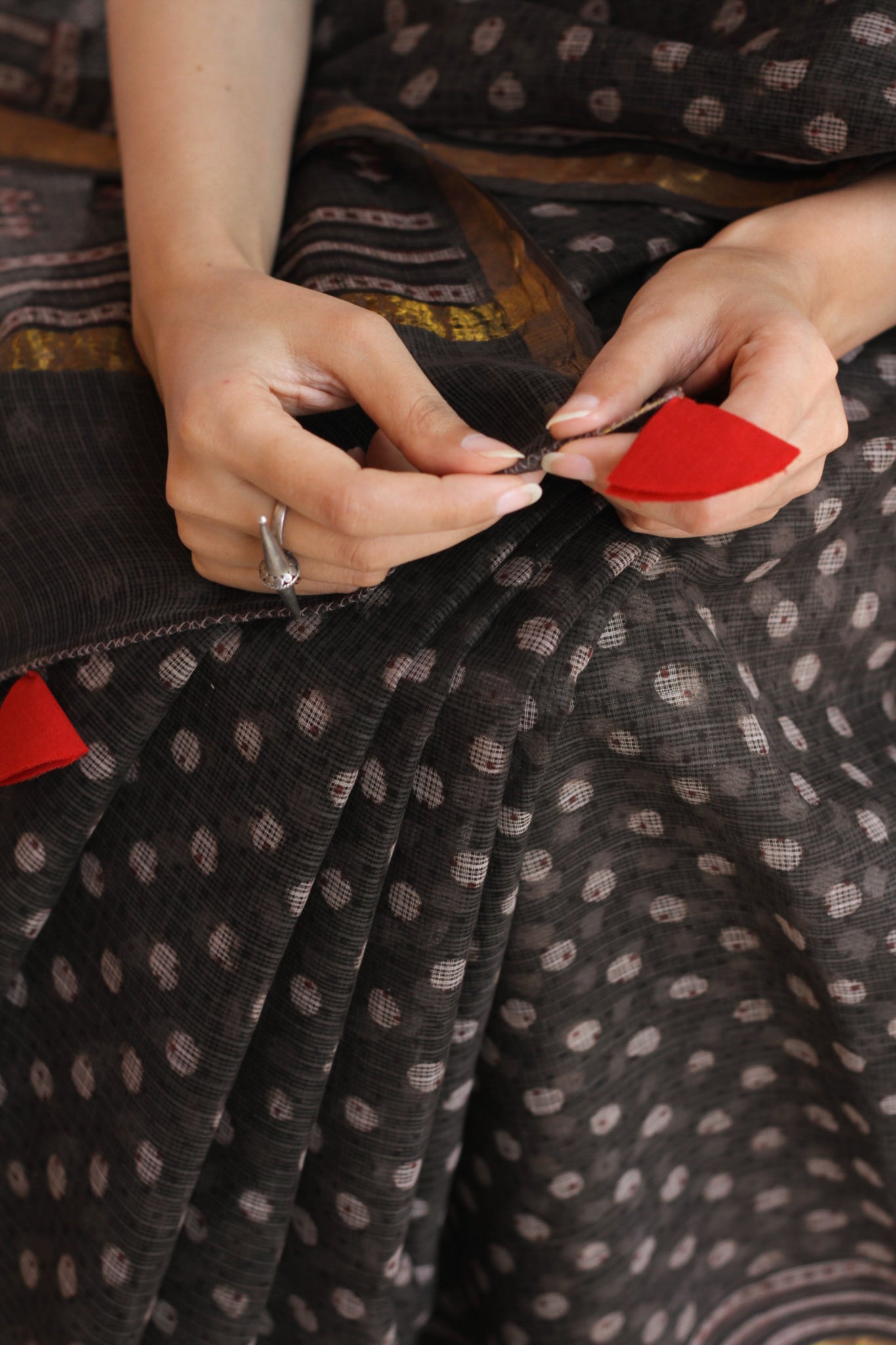To prevent color bleeding during the first wash, soak your saree in a solution of cold water and salt (1 tablespoon of salt per liter of water) for about 15-20 minutes. This helps set the dye. Additionally, you can test for color fastness by dipping a small hidden section of the saree in cold water to see if the color bleeds.
