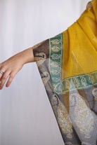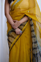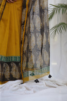 A vibrant yellow Kota Doria saree featuring a striking green and black border, enhanced with intricate Bagru handblock prints. This lightweight drape radiates festive charm, making it perfect for haldi ceremonies and summer occasions.
