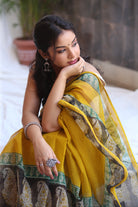 Ark : Yellow Cotton Kota Doria Saree with Green-Black Border (Bagru Handblock)