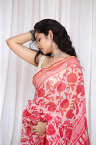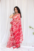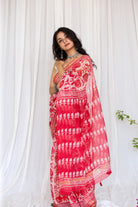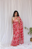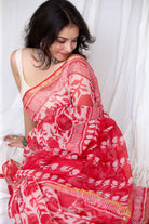 With a warm reddish base, this light and elegant Kota Doria saree showcases traditional Dabu handblock prints and soft handmade tassels—ideal for graceful daywear.