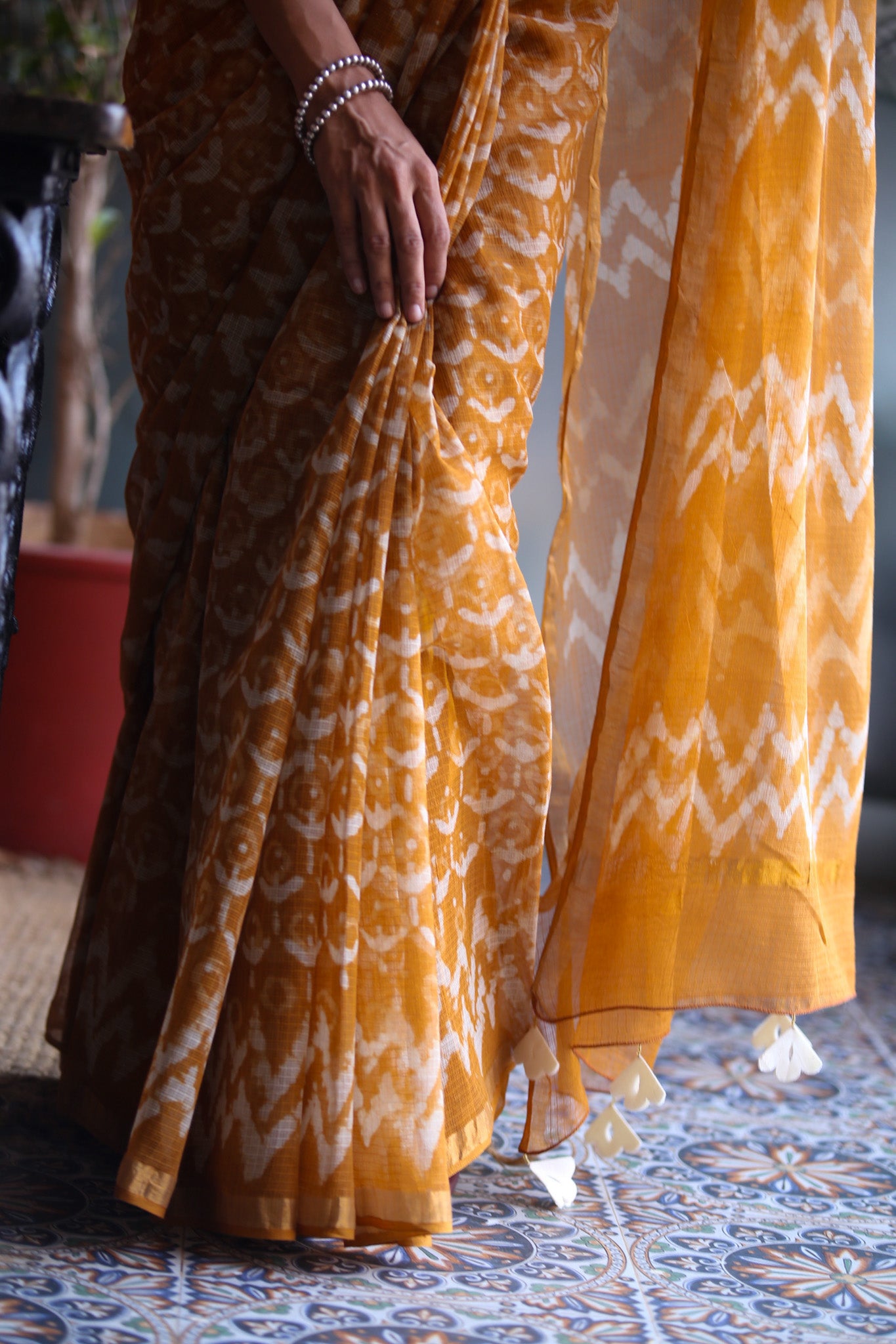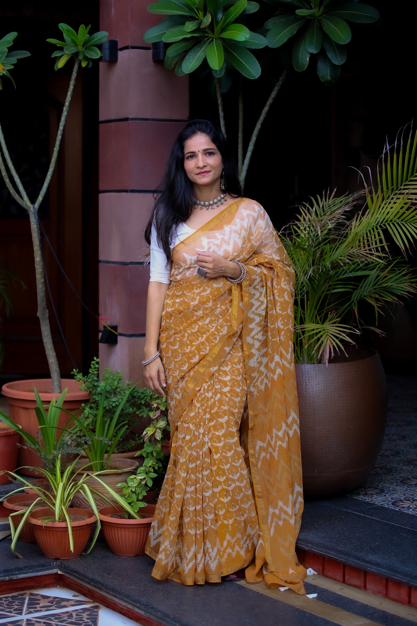 Other Details : 100% cotton, 5.5 m length, 44'' width, 80-90 cm Blouse length, Dabu is a handblock natural dye printing, Handmade Tassels on pallu. Only use mild detergents and Handwash only for longer life.