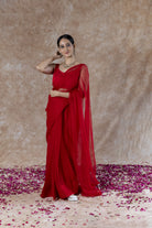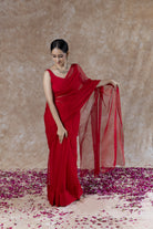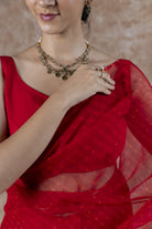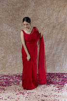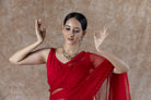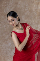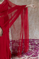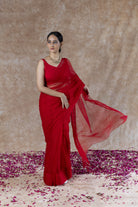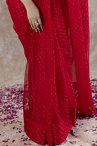 Discover the opulence of the Red Mothra (Double Lehriya) Saree, crafted from premium 100% pure silk georgette. Admire the intricate wavy designs, hand-dyed using the traditional leheriya technique by expert artisans in Rajasthan. A little bleeding of colors are seen while wearing.