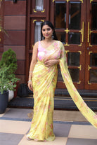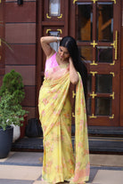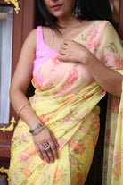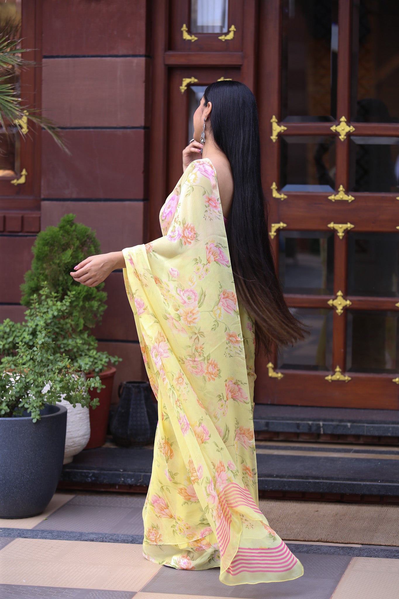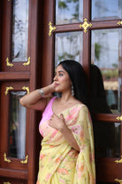 This lively light yellow colored saree is adorned with vibrant screen-printed flowers, perfect for a fresh and energetic look.